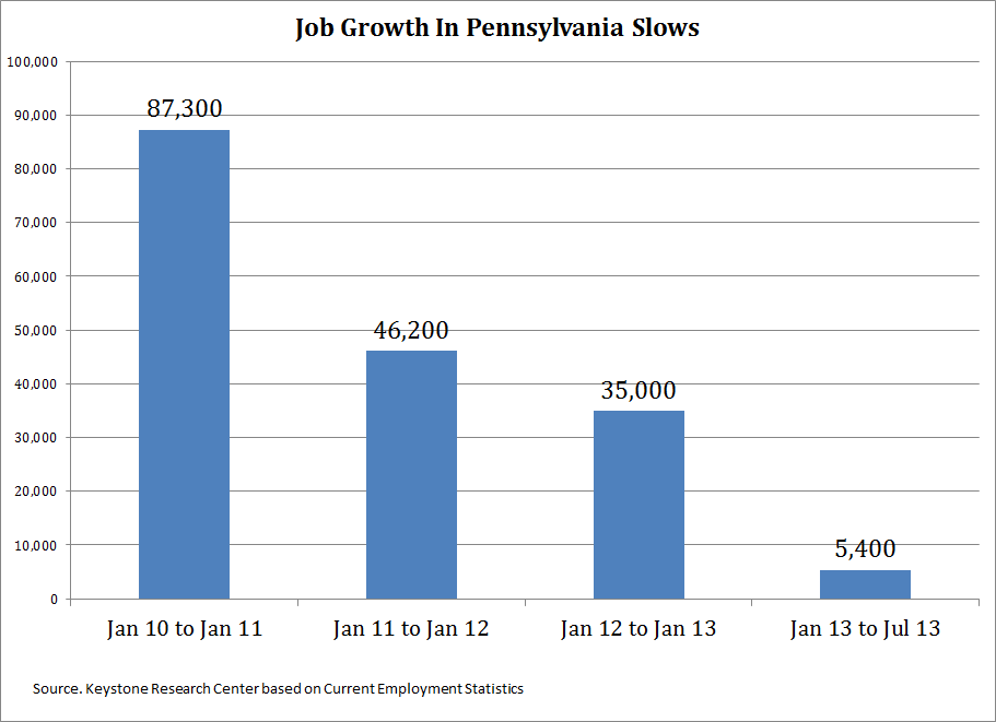 Pennsylvania created 87,300 jobs in 2010; 46,200 in 2011; 35,000 in 2012; and 5,400 in the first 6 months of 2013. In January 2011 Governor Corbett began his four-year term.